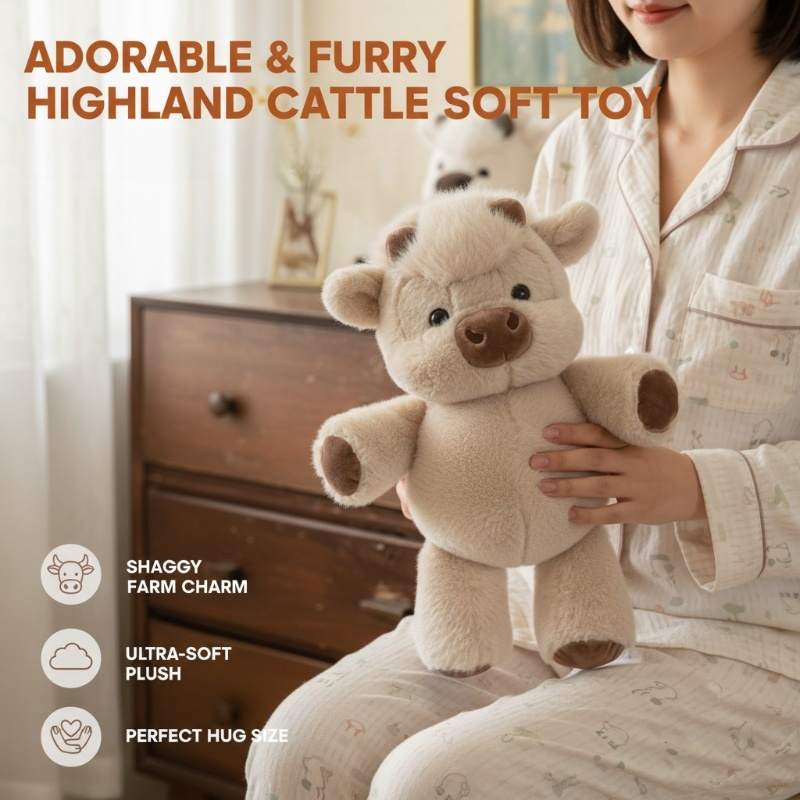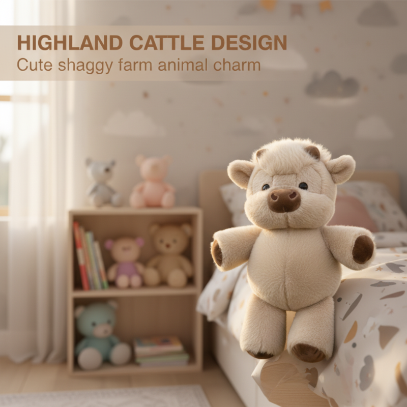 UN AMI DE LA FERME TOUT DOUX - Inspirée des adorables vaches Highland, cette peluche apporte une touche champêtre à votre intérieur. Son aspect duveteux éveille la curiosité et fait sourire les enfants, en faisant un compagnon de jeu idéal pour l'heure du conte, les jeux de ferme imaginaires et les après-midis douillets.