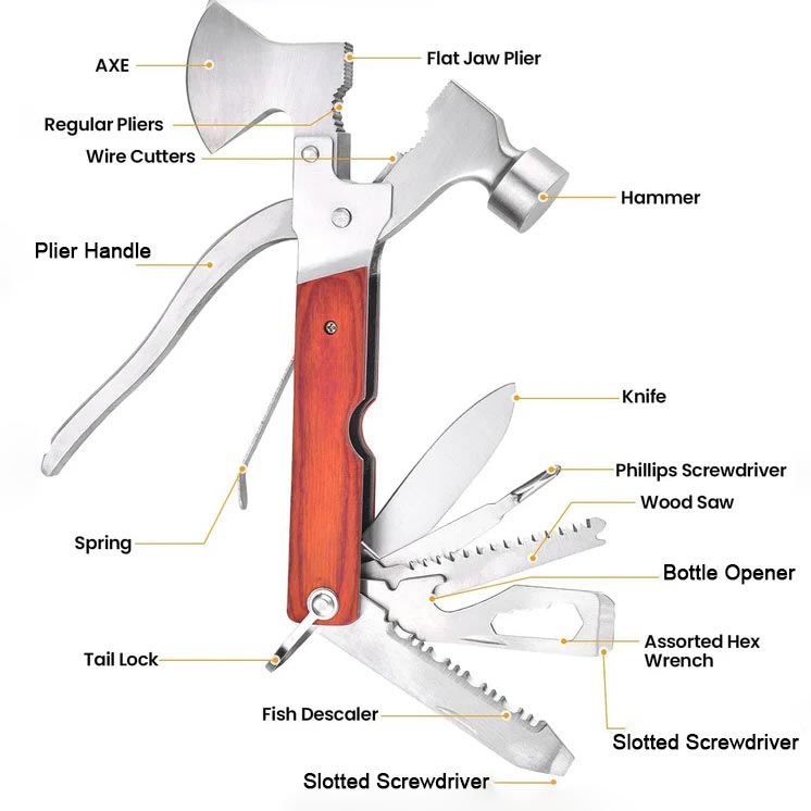 OUTIL MULTIFONCTION 16 EN 1 : Hache, marteau, pince à clous, pince à tuyau, coupe-fil, pince, couteau, couteau dentelé, lime à ongles, tournevis à tête plate, tournevis cruciformes /à fente/ hexagonaux, décapsuleur et fourchette à poisson pour répondre à divers besoins.